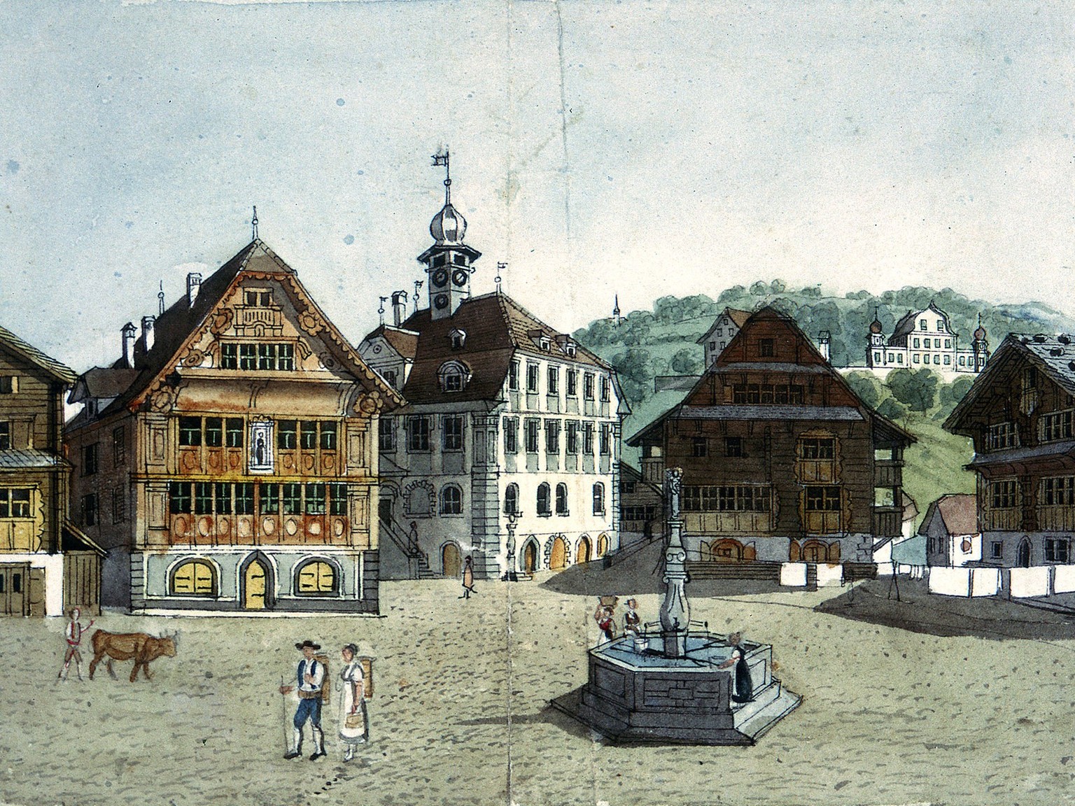 Hintersassen sitzen hinter dem Rathaus, im Gegensatz zu Landammännern, die hier herrschaftliche Häuser bauen: links vom Rathaus die Wirz, rechts die Frunz, auf der gegenüberliegenden Seite, auf dem Aquarell nicht sichtbar, die Heinzli und die Imfeld. Es kann losgehen mit der Imfeld-Saga.