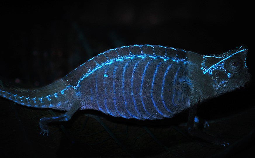 Chamäleons können nicht nur ihre Farbe wechseln. Viele von ihnen leuchten unter UV-Licht blau – wie Zähne oder weisse Kleidung in der Disco. Sonst unsichtbare Muster überziehen bei UV-Bestrahlung den Kopf der Tiere und setzen sich teils auch über den Körper fort.