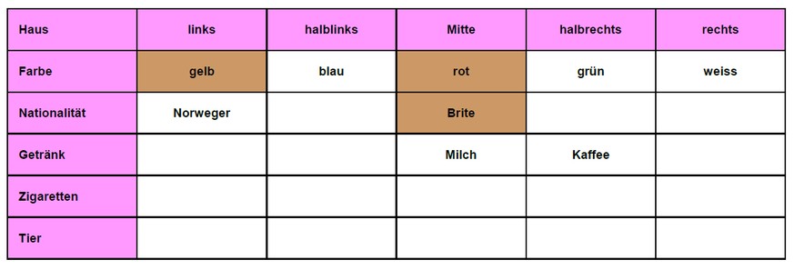 Der Brite im roten Haus kann nicht ganz links wohnen, denn dort wohnt ja der Norweger. Er kann also nur im mittleren Haus wohnen, denn das Haus halblinks ist blau, jenes halbrechts grün und das ganz rechts weiss. Für das Haus ganz links bleibt damit nur die Farbe gelb übrig.