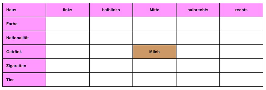 Beginnen wir mit Hinweis Nr. 7: Der Mann im mittleren Haus trinkt Milch.